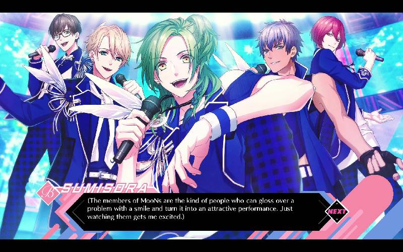 B-PROJECT RYUSEI*FANTASIA is a visual novel centred around the management of idols, in the Japanese sense of the term, i.e. personalities, in this case artistic personalities, who are role models for young people. You manage a group of 14 singers, managing their careers, musical choices and tours, as well as their personal and emotional lives, from their early days to their eventual fame.