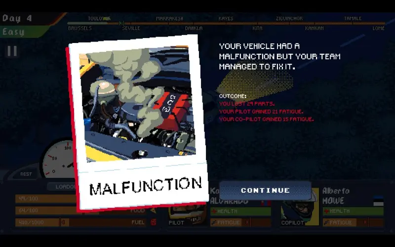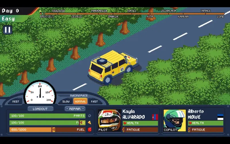 Race across vast deserts and rugged landscapes as you guide your crew through Europe and Africa. Manage your vehicle, supplies, and team while facing unpredictable road challenges. Each challenge presents tough decisions on your journey toward victory!