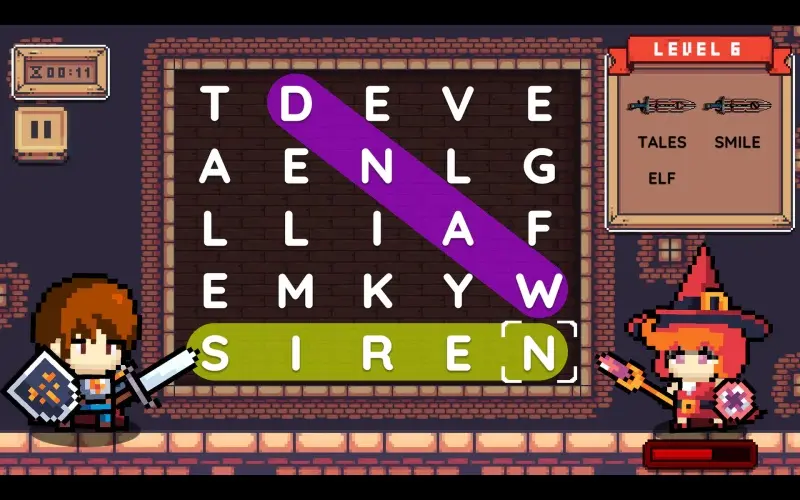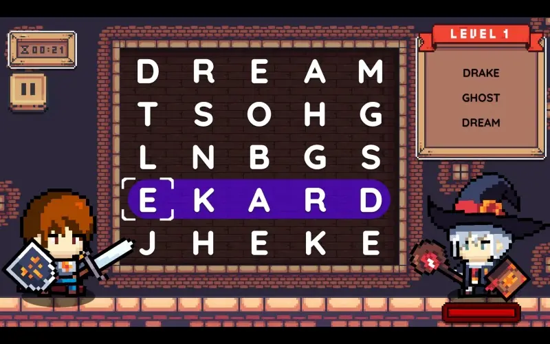 A hero wields an enchanted sword, exploring ancient castles by solving magical word puzzles. Solve hidden word grids inside ancient lands. The correct answer strengthens your path, moving closer to becoming a hero of the realm.