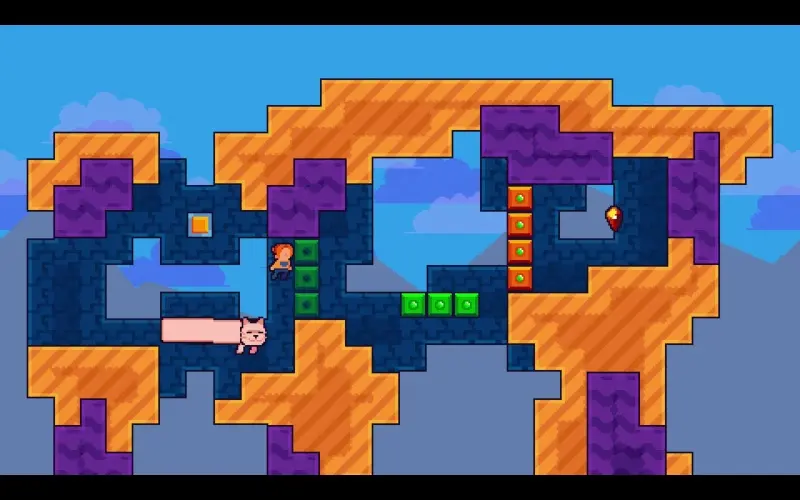 Guide a daring heroine across vibrant pixelated stages, using clever timing and perspective to overcome puzzles. Her clever cat companion helps by moving crates and forming platforms with its long body. Every level tests your cleverness as you guide this unlikely duo!