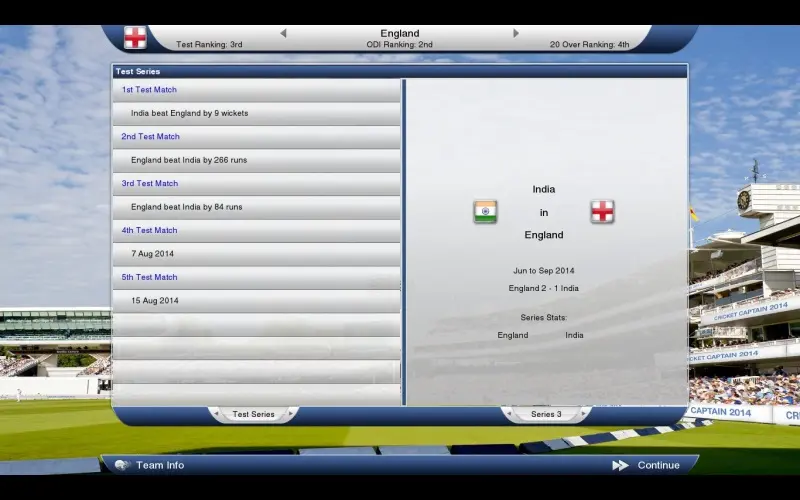 Cricket Captain 2014 puts you in charge of your favorite teams across domestic and international competitions. Featuring a redesigned interface, improved 3D highlights, and a deeply detailed player database, it offers one of the most complete cricket management experiences. Lead historic series, manage squads, analyze player stats, and guide your team to victory through strategic decisions both on and off the field.