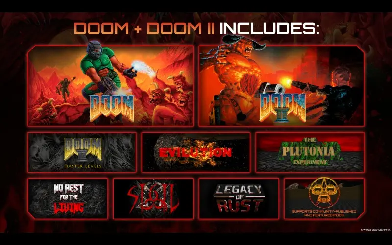This game pack contains the following games as a combined product: DOOM, DOOM II, TNT: Evilution, The Plutonia Experiment, Master Levels for DOOM II, No Rest for the Living, Sigil, Legacy of Rust, and A new Deathmatch map pack featuring 26 maps.